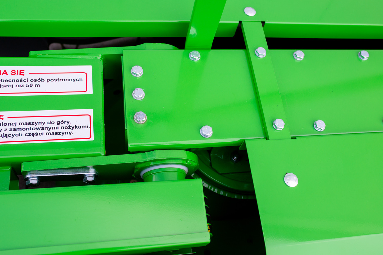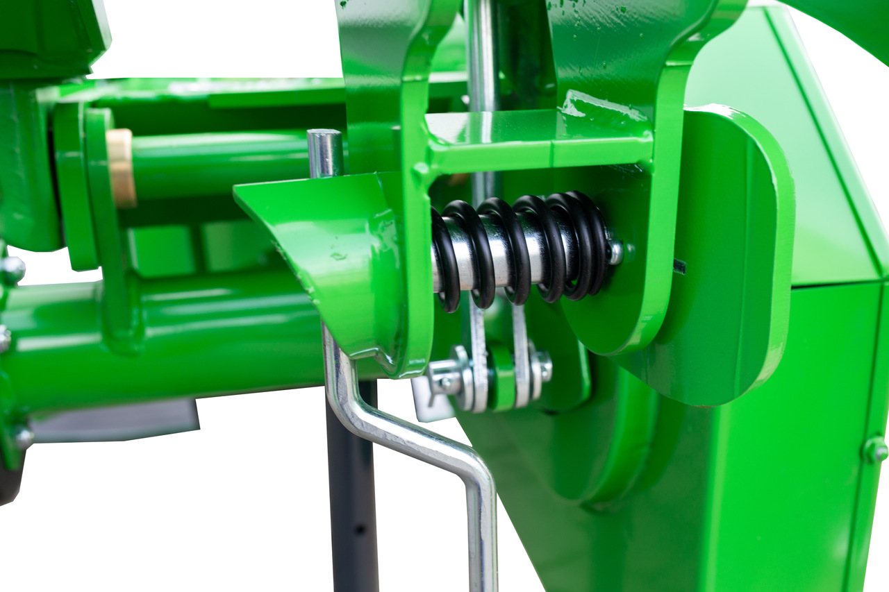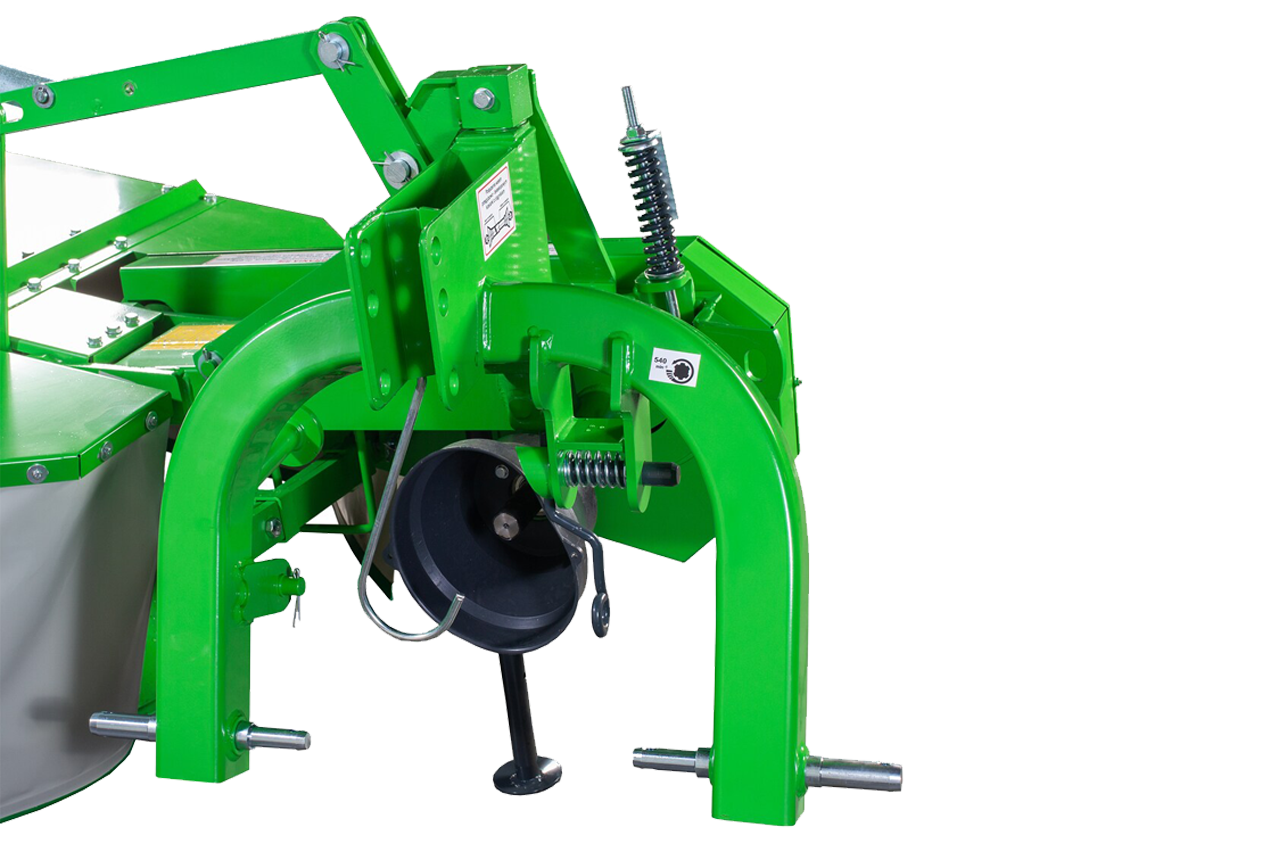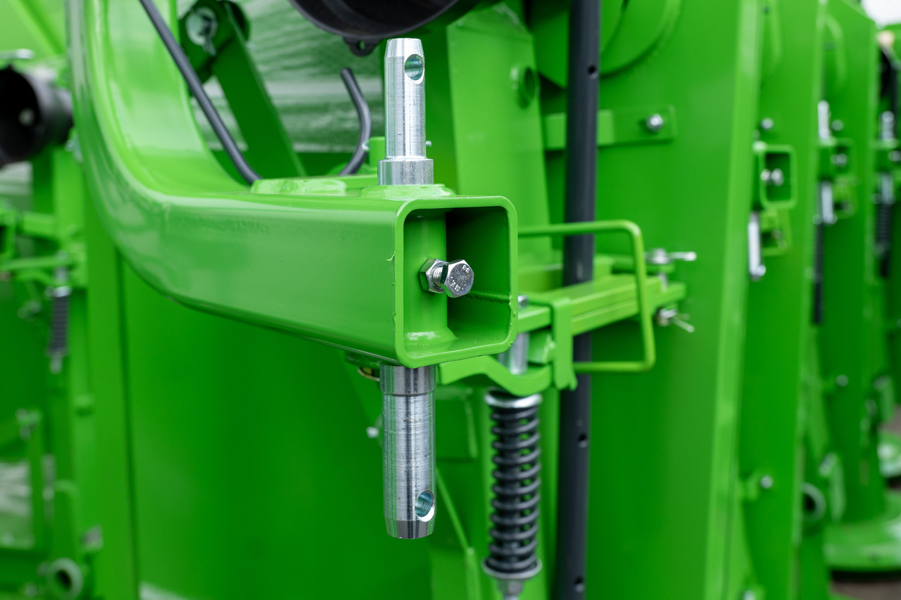 OPCJA: Dostępna jest nowa wersja trzypunktowego zaczepu do ciągnika dająca możliwość odchylenia kosiarki podczas transportu do tyłu pojazdu, chowając kosiarkę całkowicie w obrysie ciągnika. W tej opcji pozycja transportowa blokowana jest przez sworzeń, odblokowywany z kabiny ciągnika.