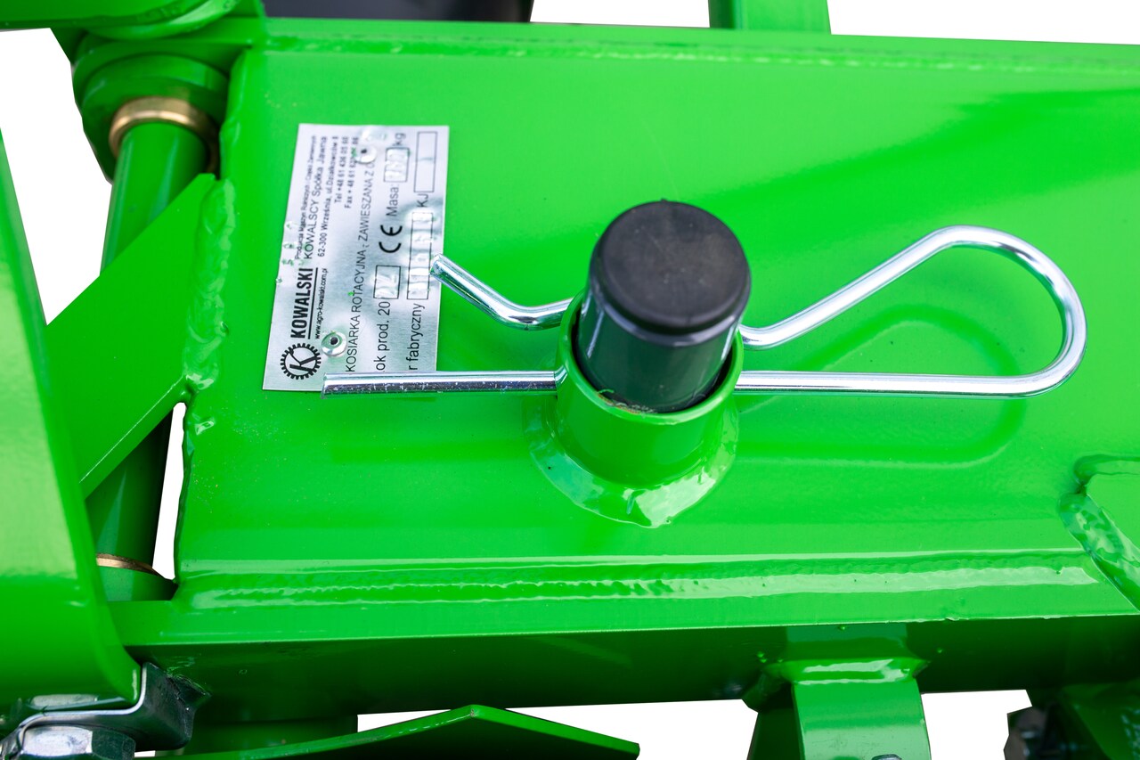 • OPCJA: Dostępna jest nowa wersja trzypunktowego zaczepu do ciągnika dająca możliwość odchylenia kosiarki podczas transportu do tyłu pojazdu, chowając kosiarkę całkowicie w obrysie ciągnika. W tej opcji pozycja transportowa blokowana jest przez sworzeń, odblokowywany z kabiny ciągnika.